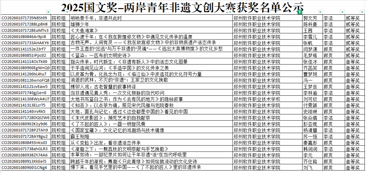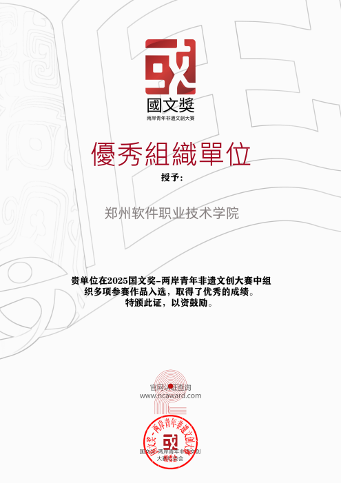 近日,国文奖-两岸青年非遗文创大赛评审结果正式公示。在李洁、郎爽两位指导教师的带领下,郑软学子从全国638所院校、2943组参赛作品中脱颖而出,最终斩获二等奖7项、三等奖22项及优秀奖若干,成绩斐然。郑州软件职业技术学院更凭借出色的组织工作,荣获优秀组织单位称号。