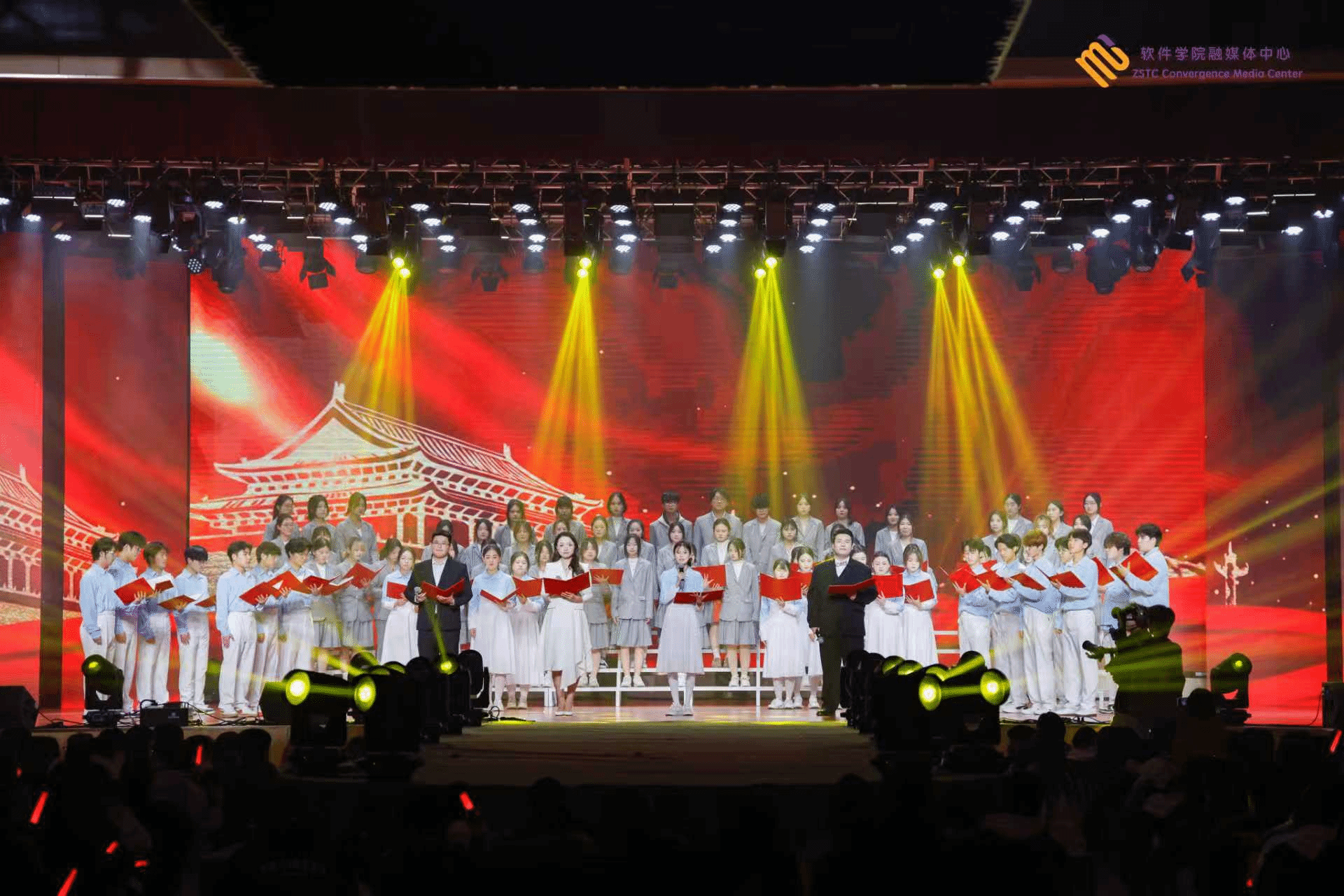 多元节目轮番上演,现场氛围持续升温,作为汇演的重磅节目,合唱与朗诵结合的《向祖国报告》将艺术感染力推向高潮,学子们用磅礴的歌声致敬五四先驱,用深情的朗诵向祖国报告初心,在回望百年征程中彰显了青年学子听党话、跟党走的责任与担当。