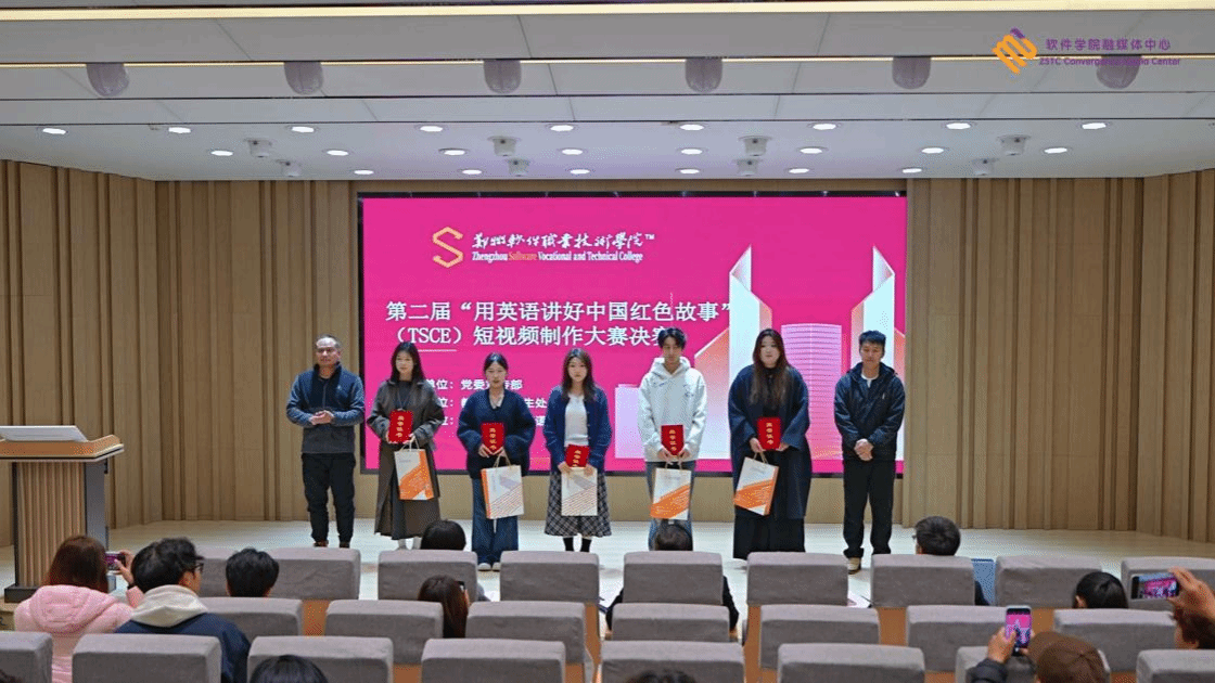 为落实党的二十大报告提出的“增强中华文明传播力影响力,坚守中华文化立场,讲好中国故事、传播好中国声音”的要求,同时响应国家加强对学生思想政治教育的号召,进一步激发广大师生的爱国热情,展示我校师生的良好精神风貌,推进我校英语教育发展。11月6日中午,由郑州软件职业技术学院教务处、学生处主办,基础教学部英语教研室承办的“Tell Stories of China in English--用英语讲好中国故事”短视频制作大赛决赛在7号楼音乐厅举办。党委副书记、党政办主任胡银着,工会主席、督查室主任马俊伟,学生处副处长王亚楠,基础教学部主任易玉坤,教务科科长彭雪芳出席本次活动并为获奖选手颁奖。本次颁奖典礼由英语教研室教师李艾徽、韩乐主持。