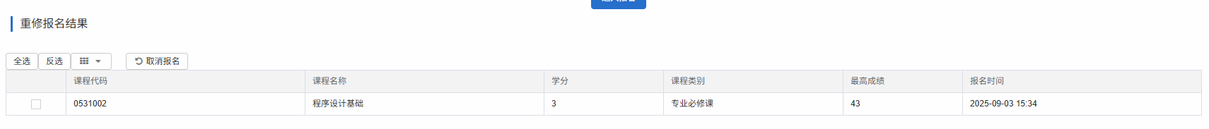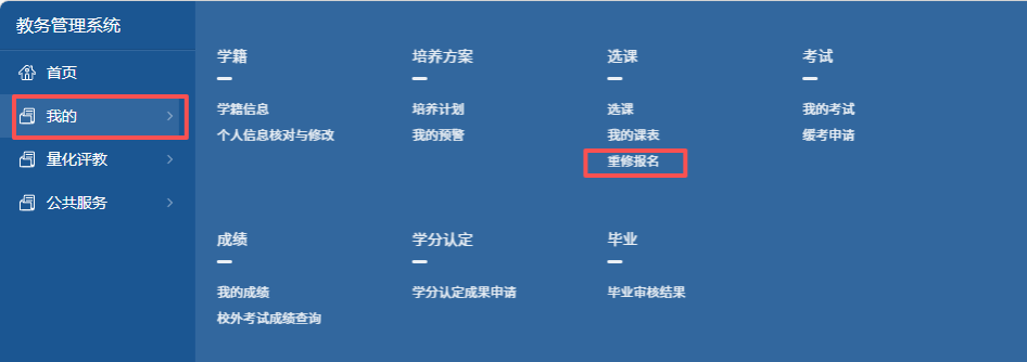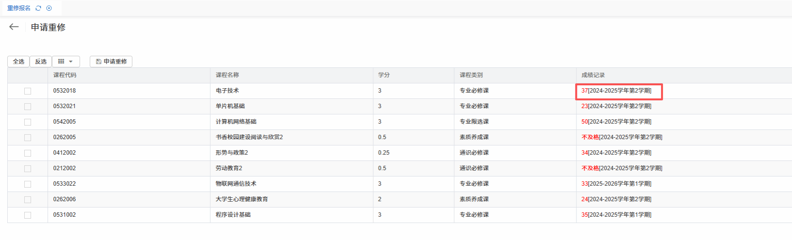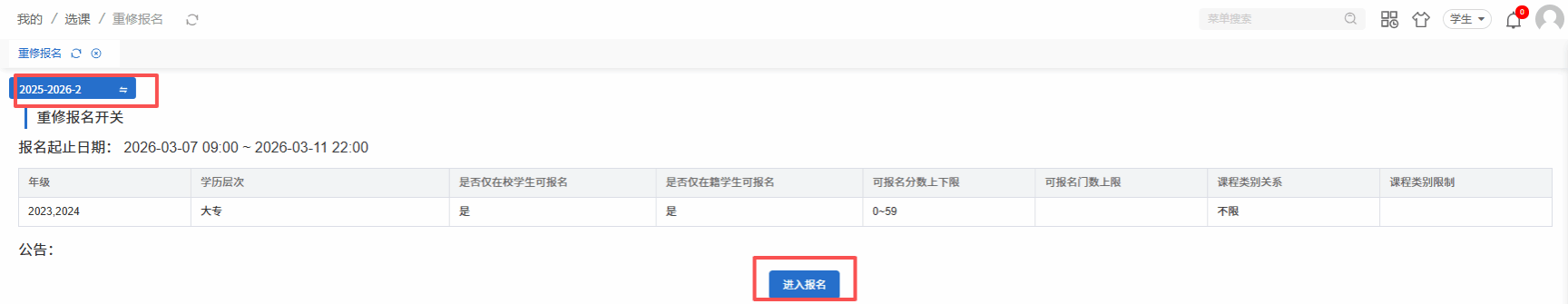 步骤一:学生登录教务系统报名,可选择多门课程重修,注意24级只报名2024-2025学年第二学期不及格的课程。流程如下:
