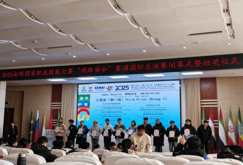 12月13日,2025金砖国家职业技能大赛网络安全赛项国际总决赛在山东青州圆满落幕。郑软学子经过与来自金砖及金砖+国家的68支参赛队伍激烈角逐,我校参赛队伍凭借扎实的专业技能和出色的团队协作,最终荣获大赛三等奖。
