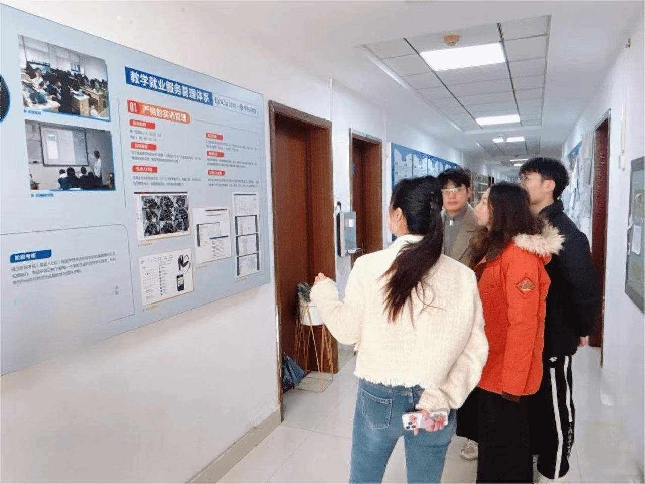 华蓝集团作为智能科技领域的深耕企业,现场向学院一行展示了其在产教融合领域的实践成果:通过与多家科技企业深度联动,已构建起涵盖AIGC、嵌入式物联网开发、JavaEE全栈开发、AI机器视觉等核心方向的产业生态,同时配套产业学院、实习实训、定向培养等人才输送体系,实现“课堂—项目—岗位”的无缝衔接。在技术展区,企业人员详细介绍了工业级机器视觉检测系统、嵌入式STM32开发平台等教学实训设备,以及智慧工业、AIGC等实际落地项目,其“理实一体、学用结合”的项目化培养模式,与学院专业课程体系高度契合。