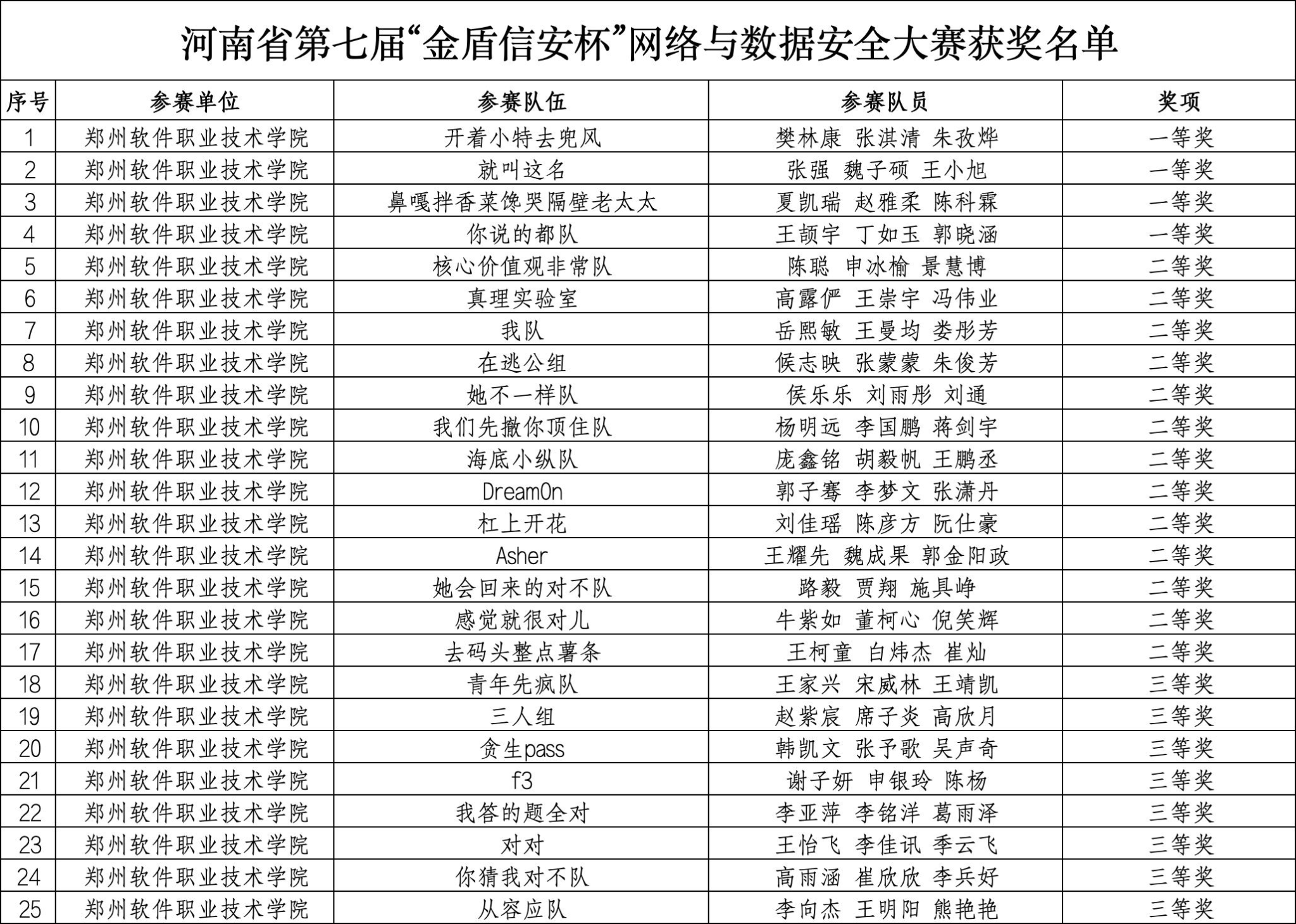 本次大赛由河南省计算机学会、河南省网络空间安全协会主办,河南省网络安全高校战队联盟、河南金盾信安检测评估中心有限公司承办,河南信安世纪科技有限公司提供技术支撑。大赛采取CTF夺旗模式,吸引来自全省的90余所院校、1200余支参赛队伍、3500余名选手参赛。大赛设置理论题100题,CTF技能题25题,经过8小时的鏖战,我校获奖情况如下: