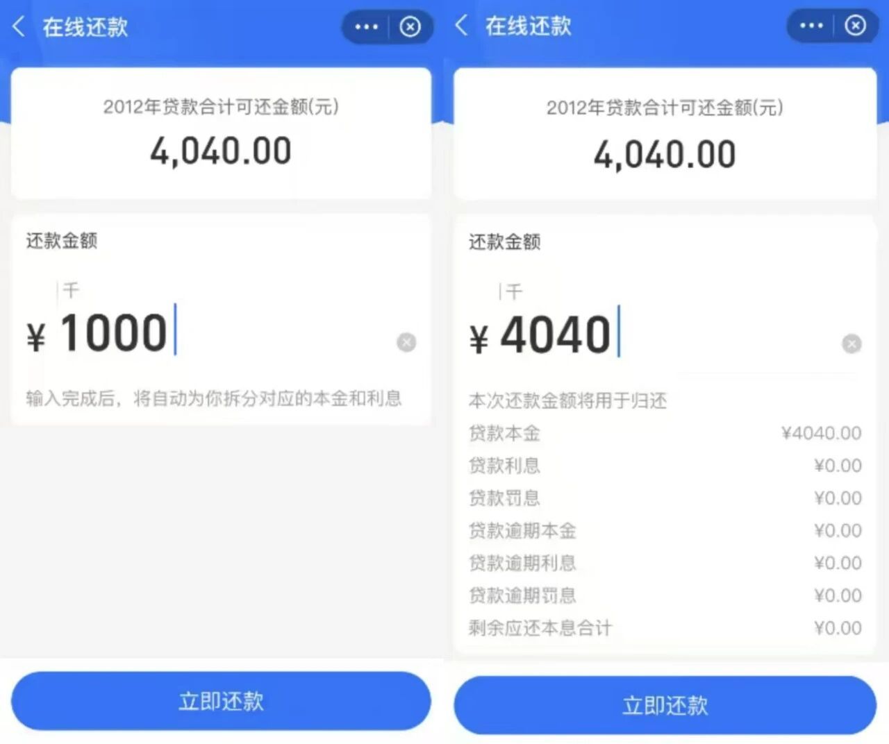 进入立即还款页面后,可自定义输入本次还款金额,小程序会根据输入金额自动拆分对应的本金和利息。