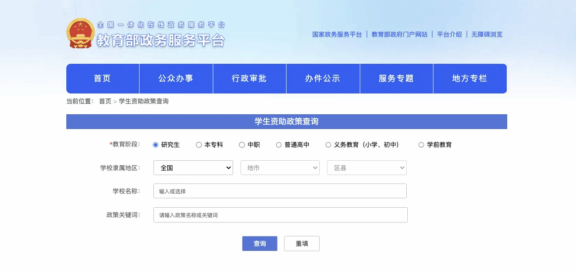 1.访问教育部政务服务平台(https://zwfw.moe.gov.cn/,即教育部官方网站服务板块),在“查询服务”板块,选择使用“学生资助政策查询服务”;