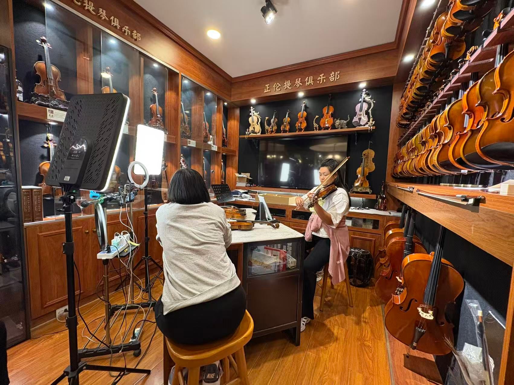 而后,师生集体观摩了琴行的网络直播带货环节。直播团队详细展示了从直播选品、脚本撰写,到镜头调试、互动话术设计的直播全流程。