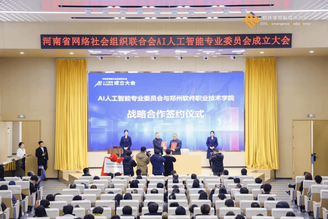 12月11日,河南省网络社会组织联合会AI人工智能专业委员会成立大会在郑州软件职业技术学院举行,旨在有效推动河南AI产业产学研用融合、打造中部AI创新高地。本次大会,河南省网络社会组织联合会AI人工智能专业委员会与我校签约战略合作框架协议,建立长期战略合作关系。校长秦方奇教授获聘河南省网络社会组织联合会AI人工智能专业委员会副主任委员。