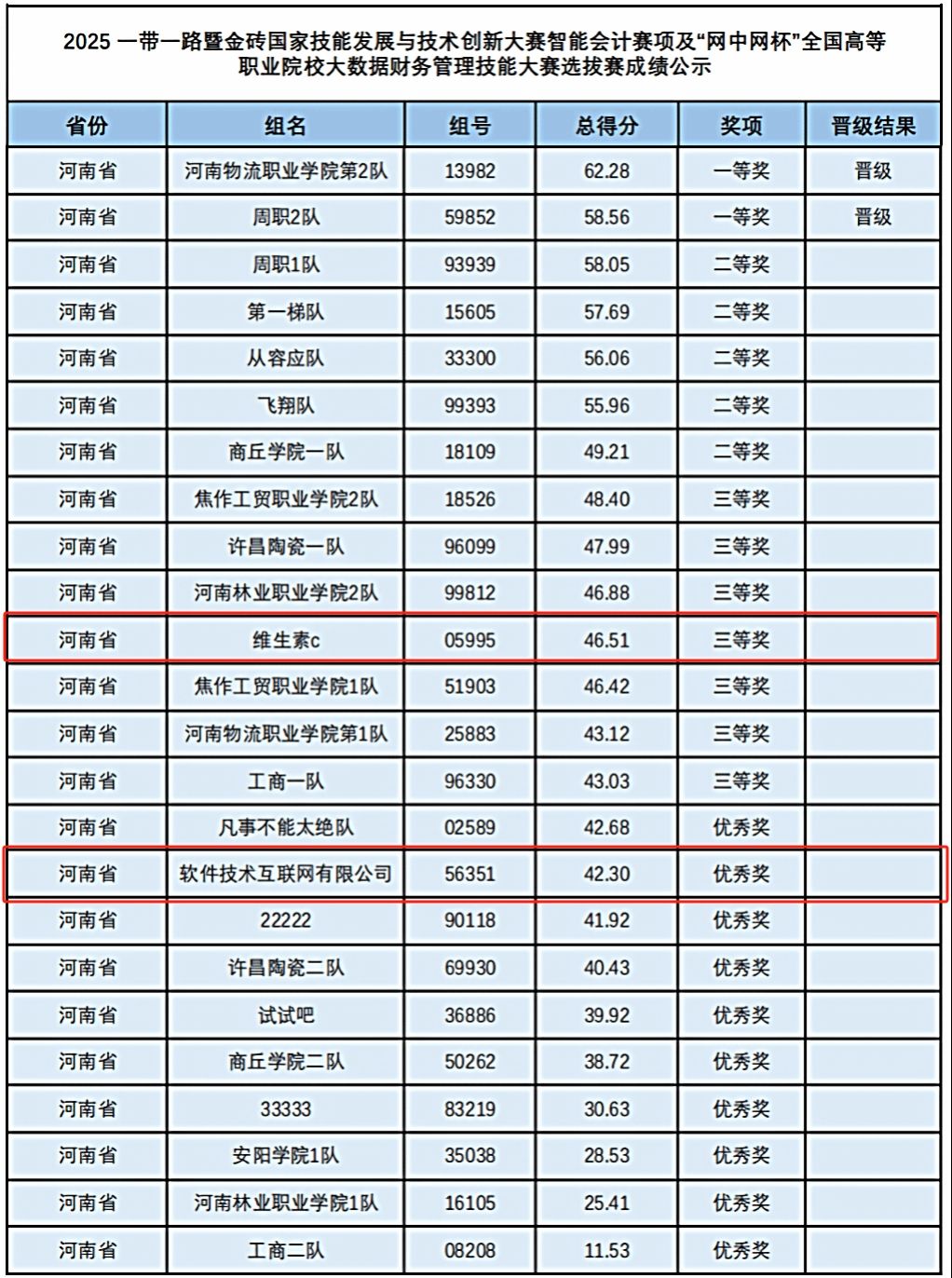 近日,第十四届“网中网杯”全国高等职业院校大数据财务管理技能大赛全国选拔赛圆满结束。我校学子在孙坤铭老师的悉心指导下,两支队伍成功脱颖而出,其中由陈曦担任组长的“维生素C队”荣获三等奖,由陆思诺担任组长的“软件技术互联网有限公司队”荣获优秀奖。
