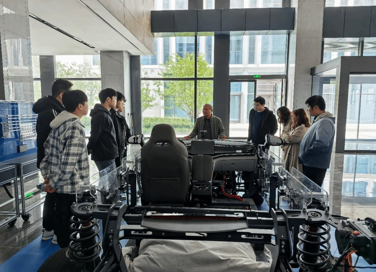 在郭军利教授的引导下,师生代表先后参观了嵩山实验室的汽车实训区、智能控制演示区和数据检测研究区域。郭教授结合行业前沿技术,详细讲解了新能源车辆的关键工艺流程、动力系统构造及相关应用案例,并针对学生专业学习和能力提升提出了宝贵建议。