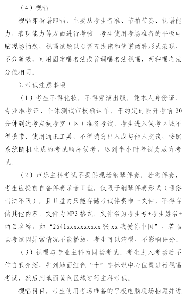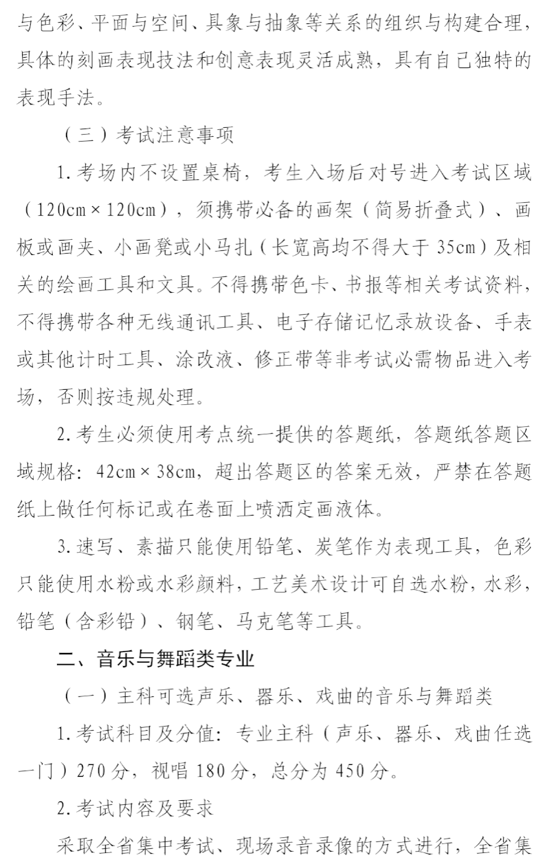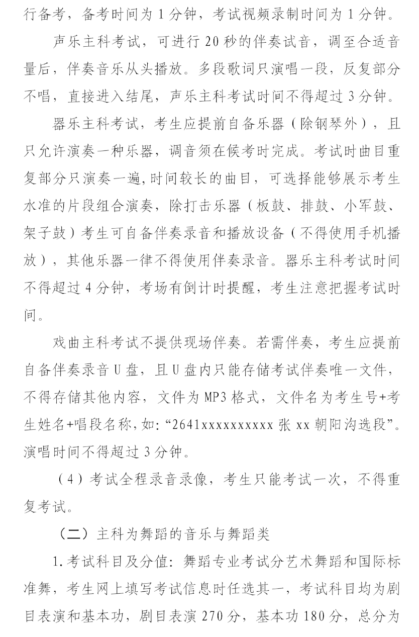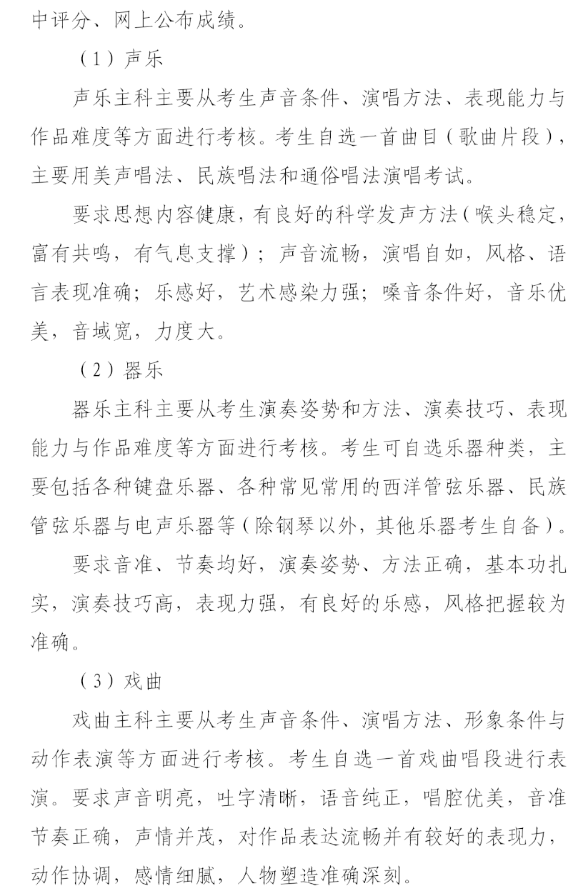 答:(1)音乐与舞蹈类考试按主科类别(包括声乐、器乐、戏曲和舞蹈,考生任选其一)分别安排。