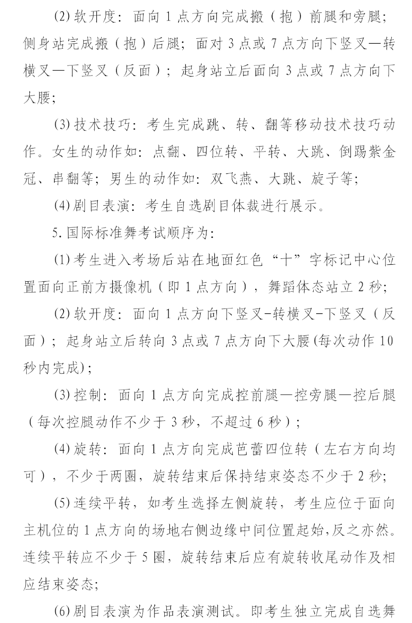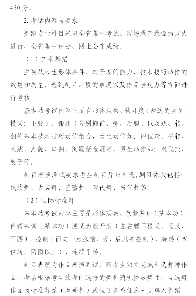 (3)舞蹈专业考试(分为艺术舞蹈和国际标准舞,考生任选其一),考试科目及分值:剧目表演270分,基本功180分,总分450分。