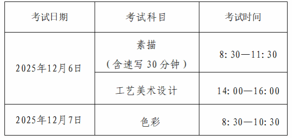专业考试与普通高招美术与设计类专业省统考统一安排,考试时间安排如下: