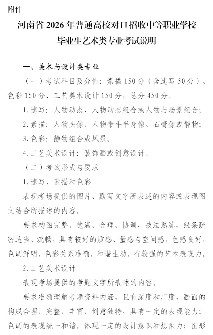 具体考试要求详见《河南省2026年普通高校对口招收中等职业学校毕业生艺术类专业考试说明》(附件)。